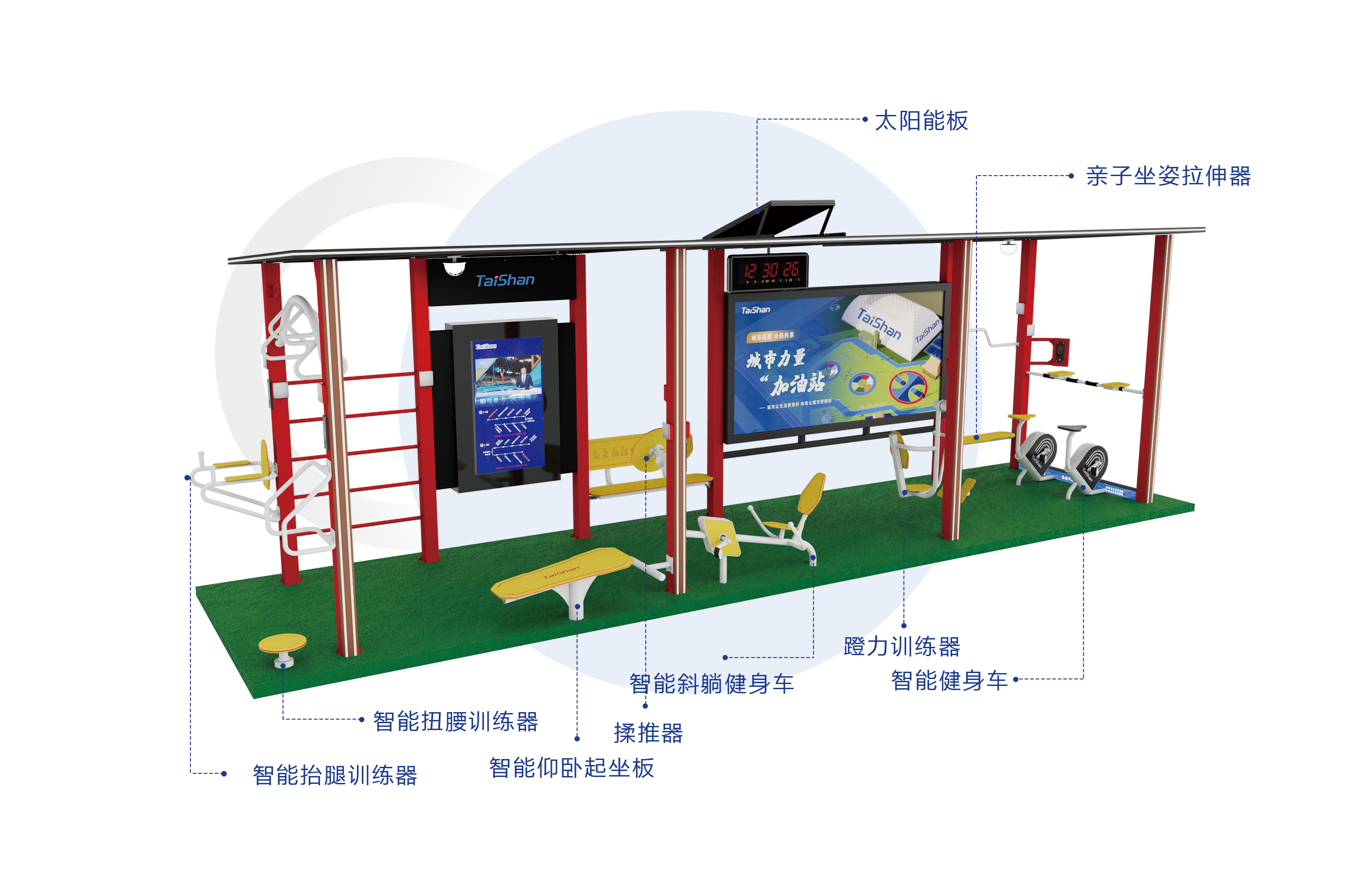 可实现太阳能供储电及能源转换控制的智能健身驿站针对老年人和青少年的身体结构特点设计,各包含12款各种运动功能的健身器材,可采集到用户的运动数据,结合一体化体测机,为市民提供体质检测服务,并实时上传云平台,提供锻炼建议,“科学运动”打造更健康的生活方式。