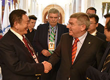 中国自行车运动协会主席崔大林向国际奥委会主席巴赫介绍 米兰集团瑞豹自行车