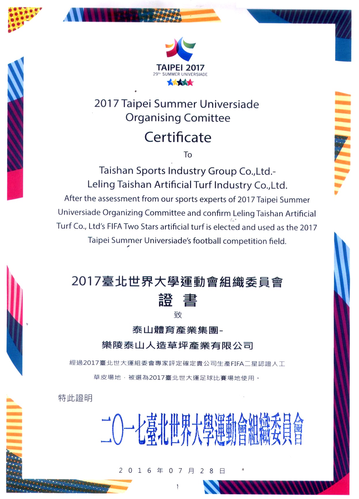 2017台北世界大学运动会组织委员会证书致乐陵米兰集团人造草坪产业有限公司